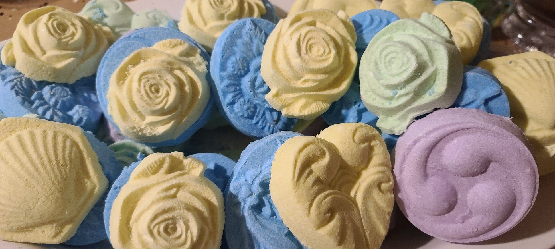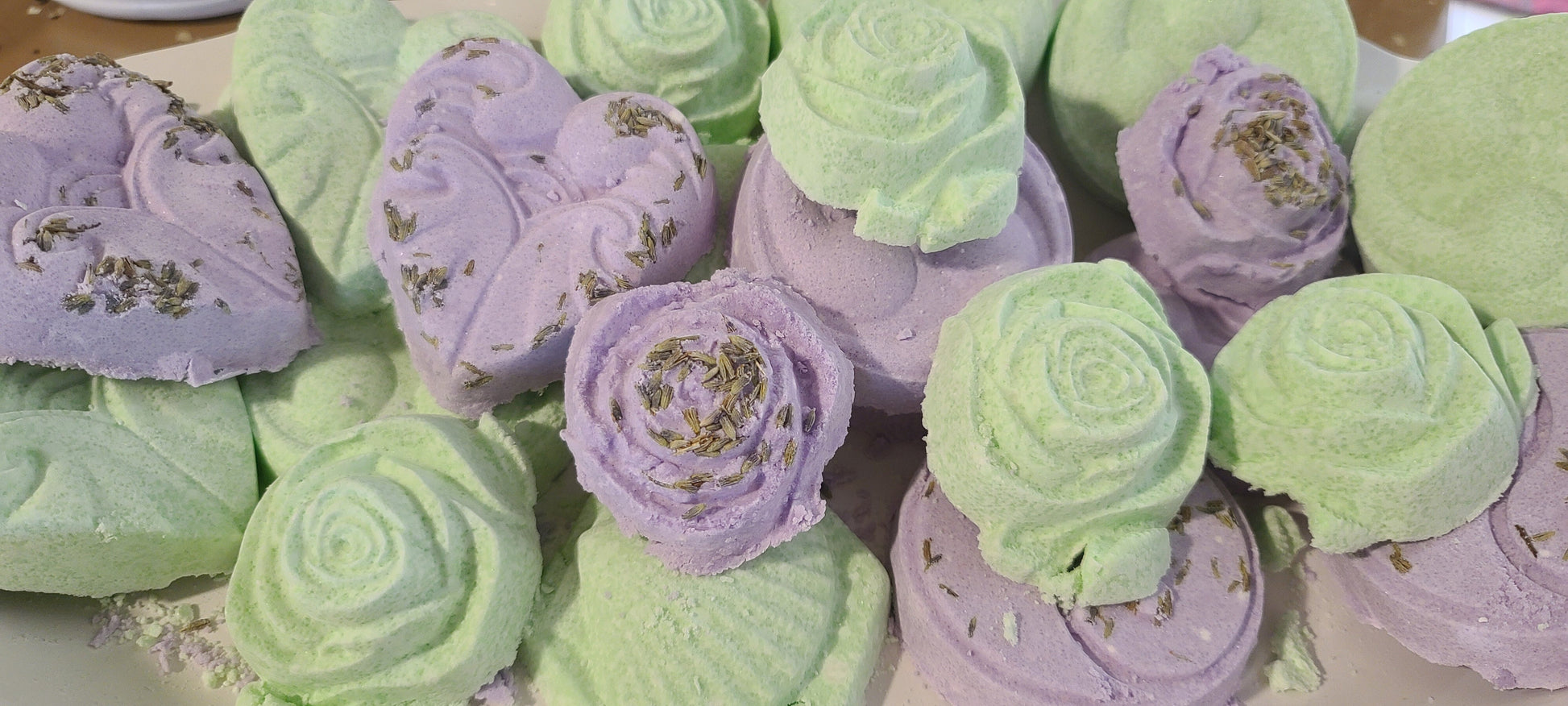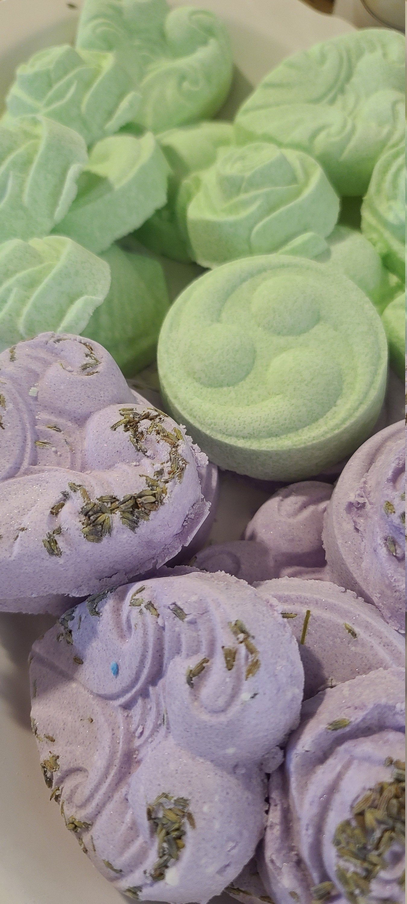 Baking Soda, Cornstarch, Mica Powder (Various colors) Citric Acid, Lemongrass Essential oil, Peppermint Essential Oils, Lavender Essential oils, Eucalyptus Essential oils