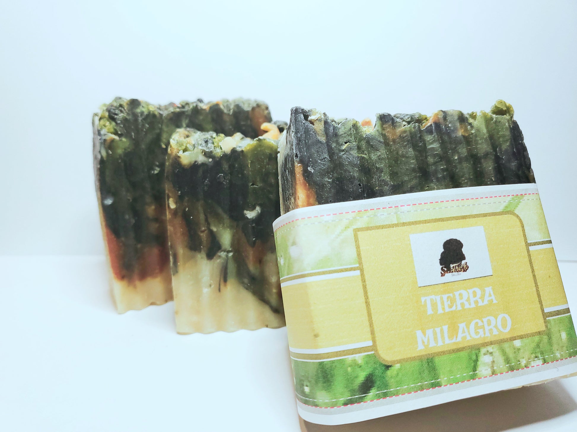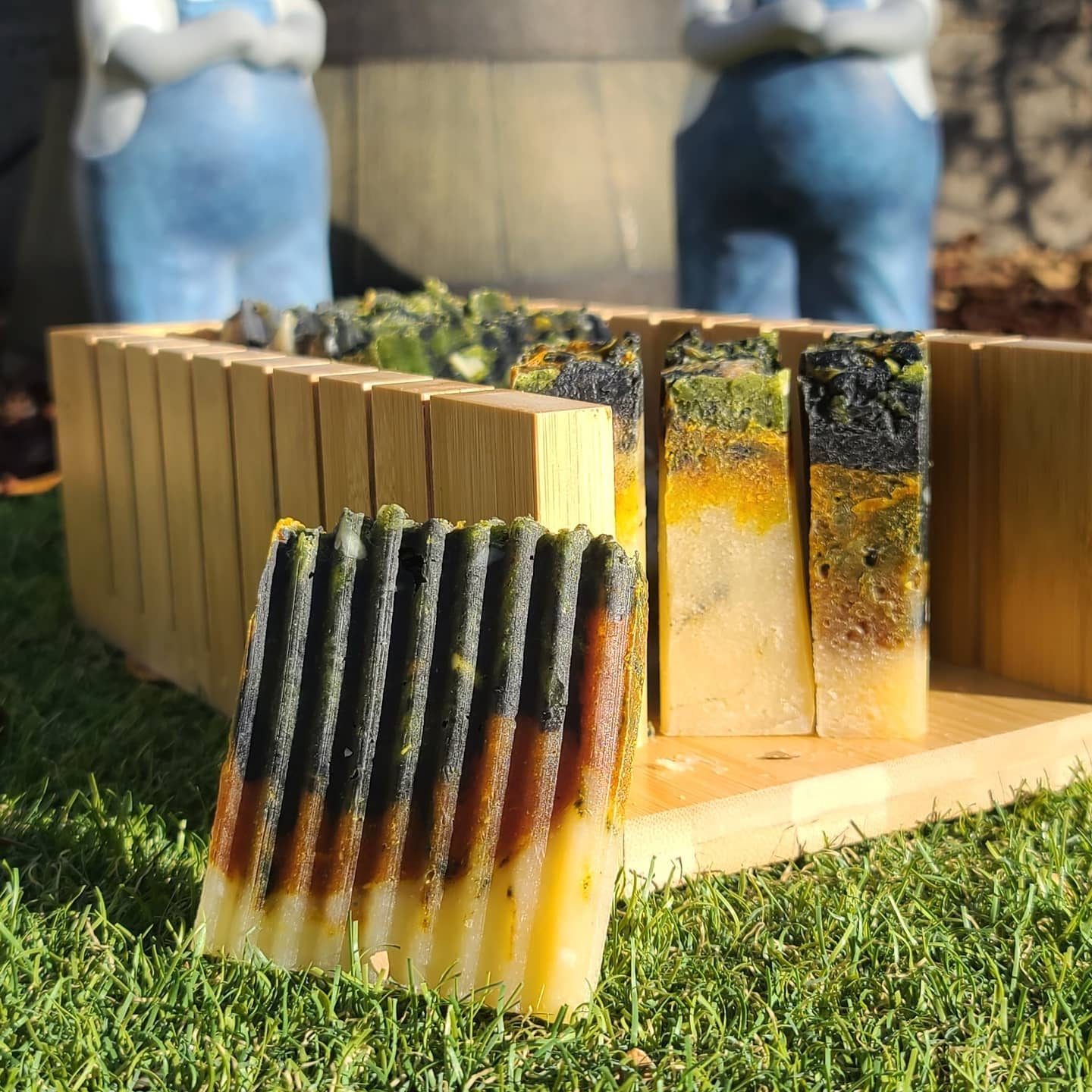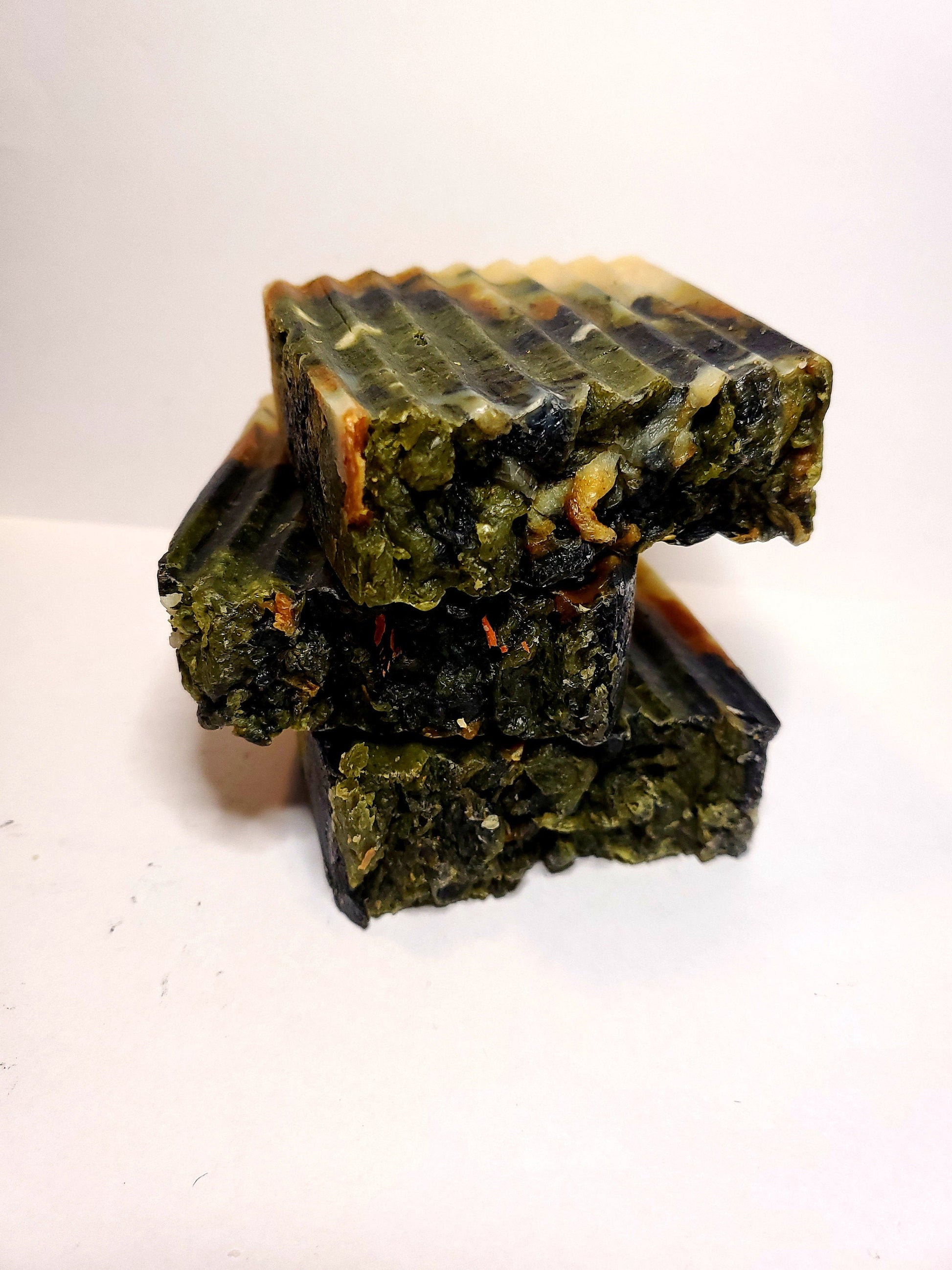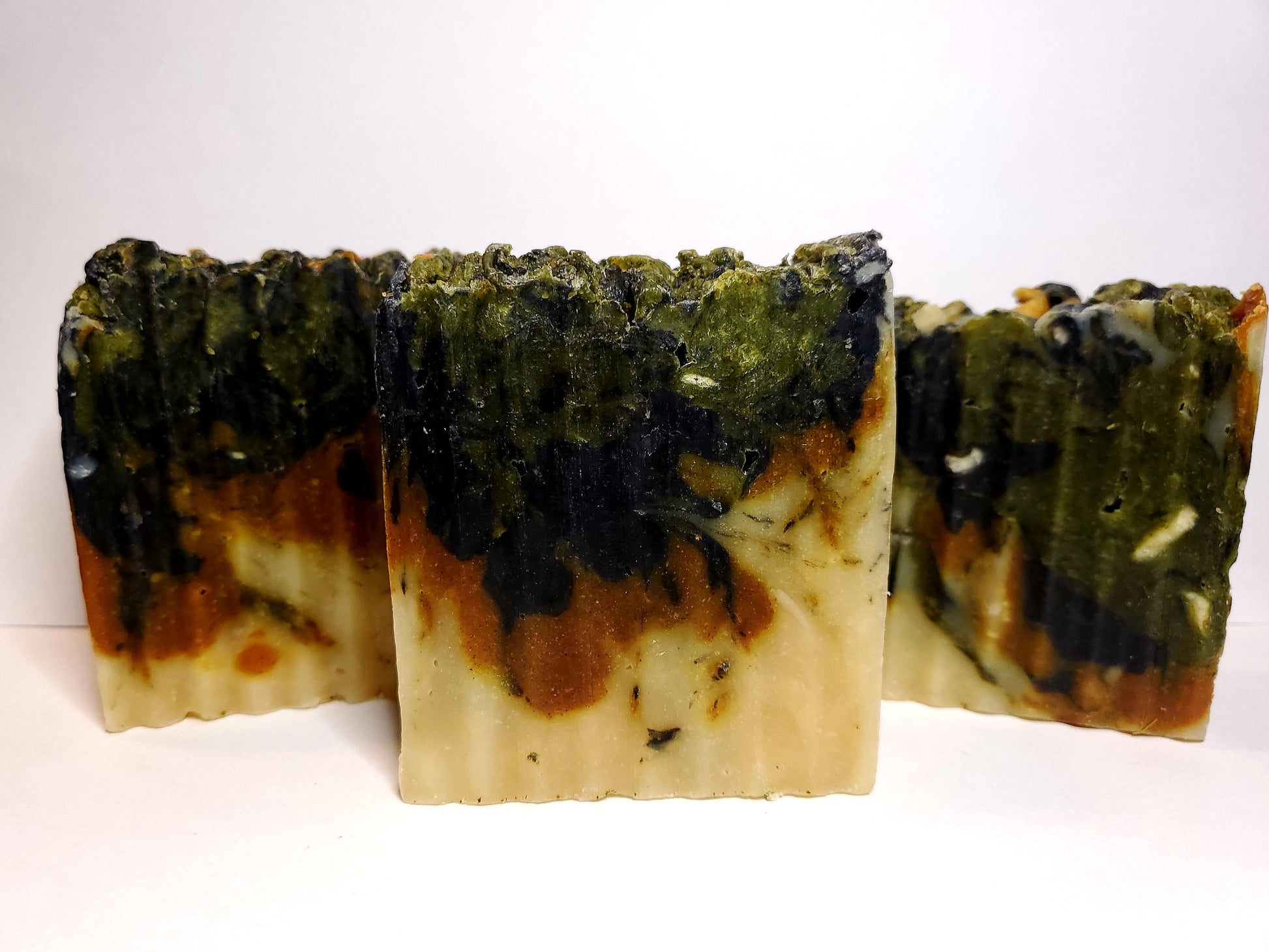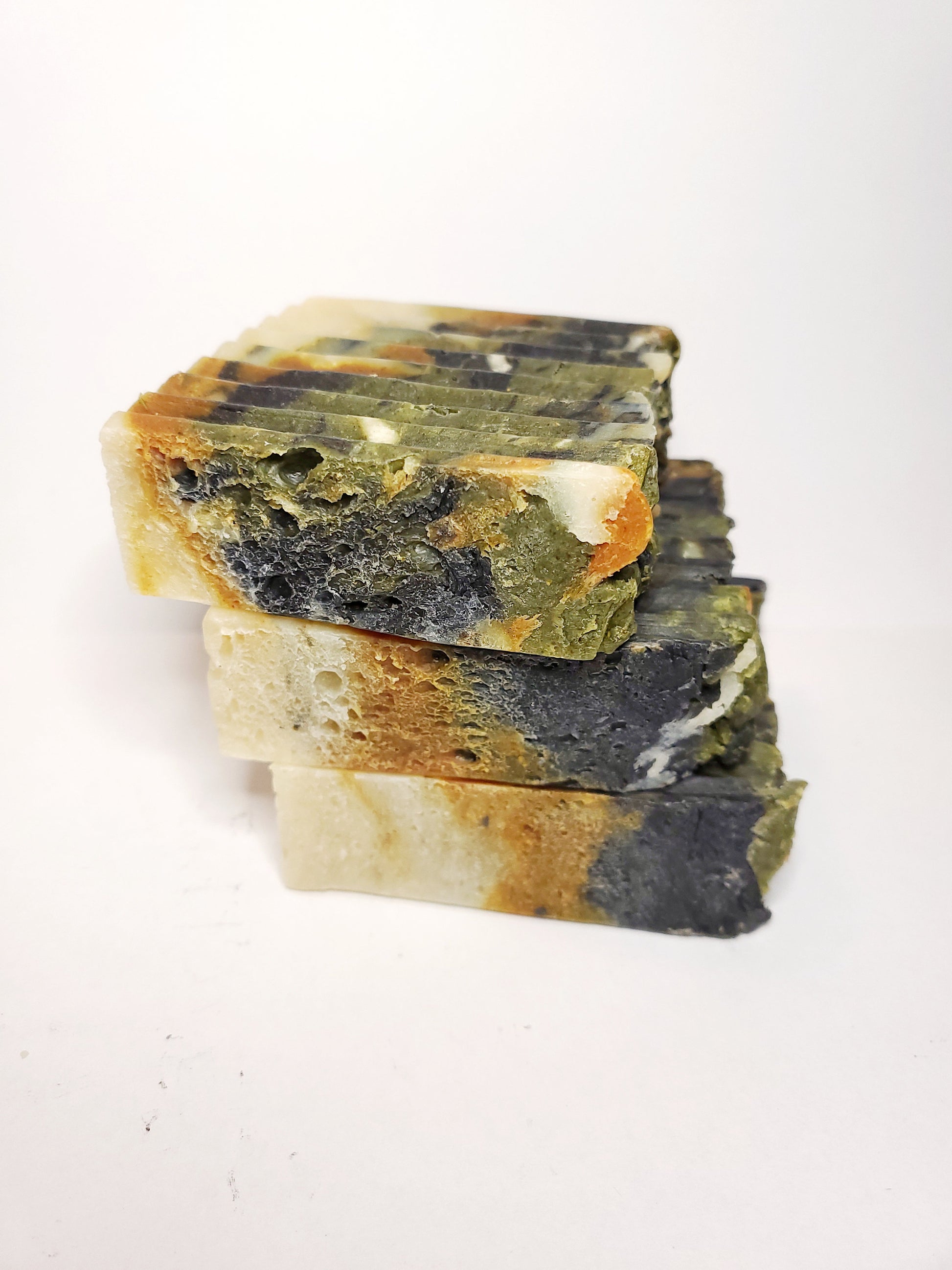 This body bar is made with Moringa powder, Turmeric Powder, and activated charcoal to help with Eczema and troubling skin conditions! It is scented with Tea Tree essential oils.