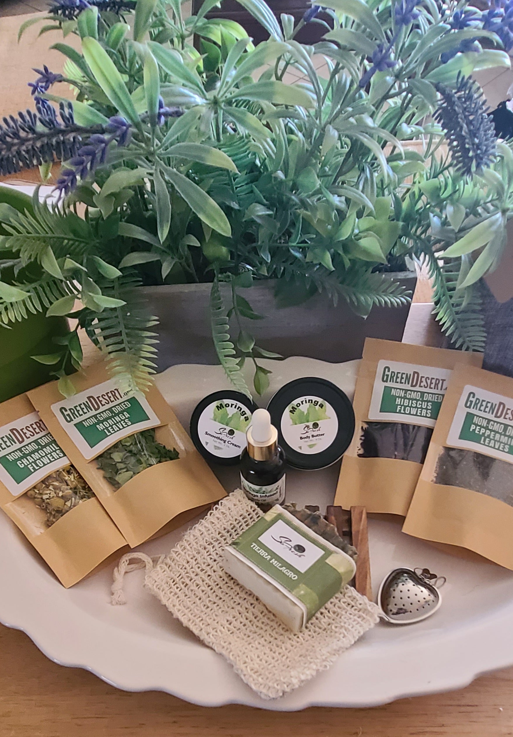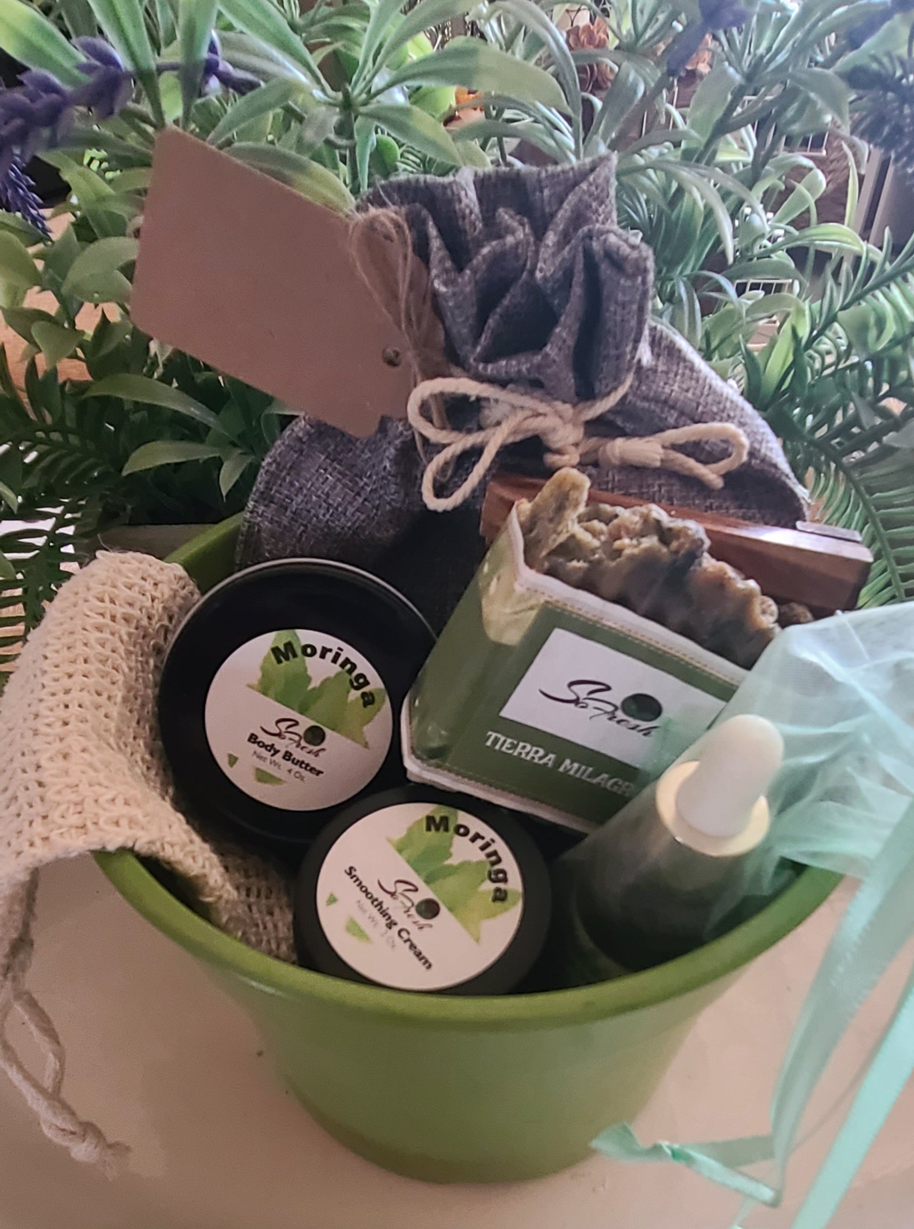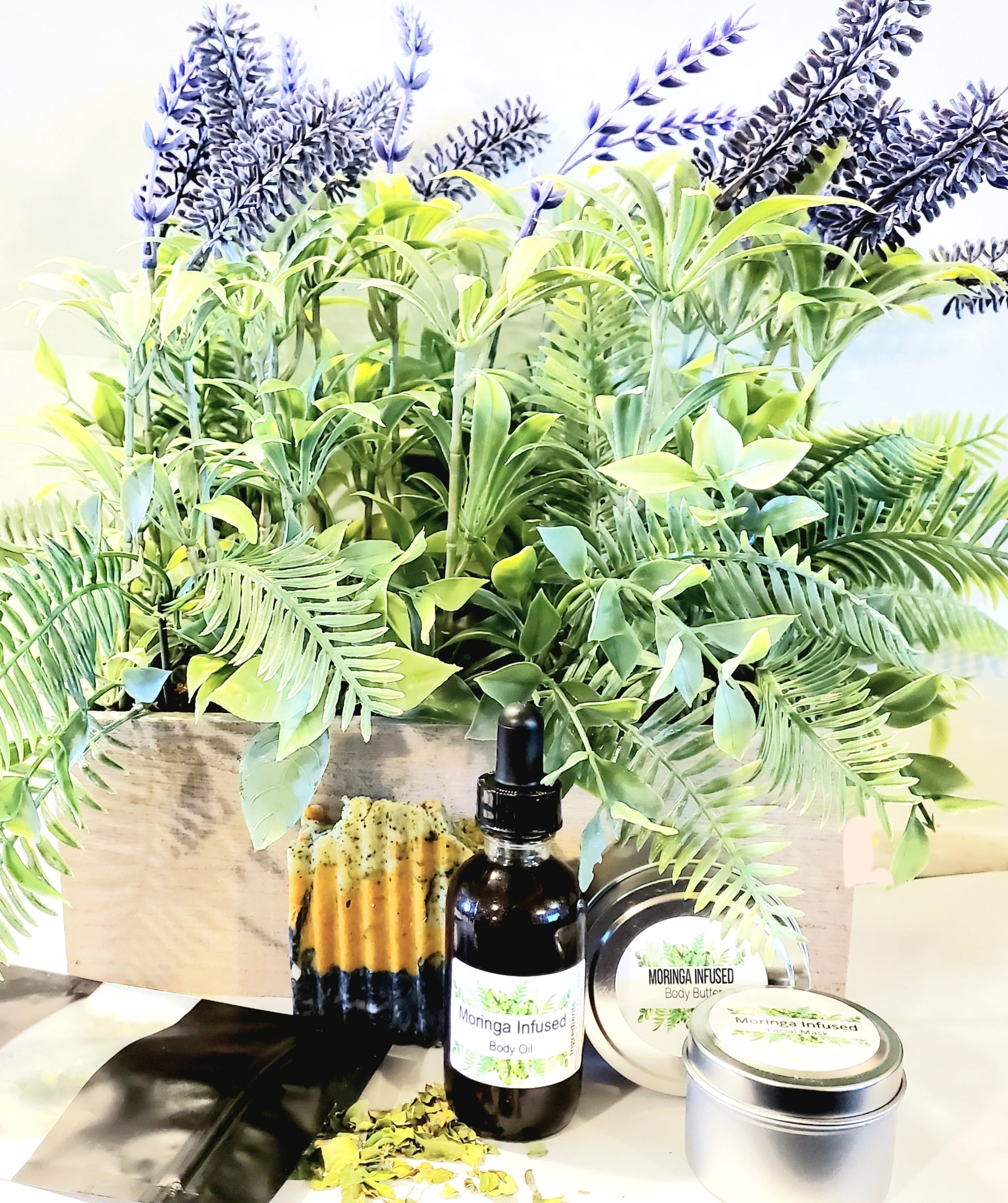 Receive our new Moringa Infused Body Butter, Infused Moringa body Oil, Moringa Smoothing Cream, Tierra Milagro Soap Bar, Dried Moringa Leaf Tea, and Moringa seeds for planting.